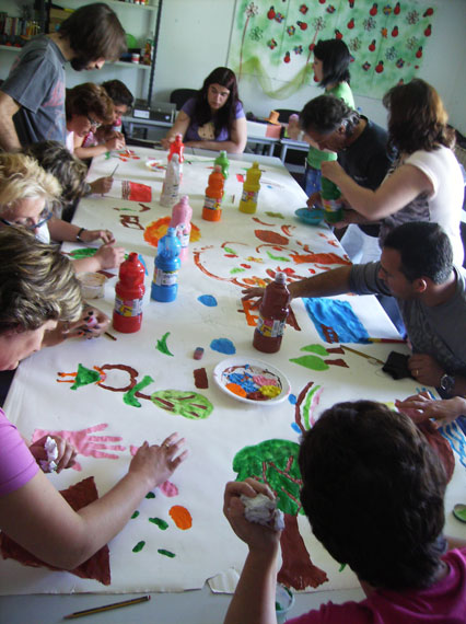 Nesta actividade de Expressão Plástica pintamos com os olhos vendados acompanhados com uma música suave, tentando pintar ao decorrer da música e trocando de lugares ao longo do grande mural de papel de cenário. Percebemos que abordámos as garatujas, e os primeiros desenhos da infância. Depois, fizemos ainda uma pintura sobre a nossa infância, já sem os olhos vendados, e com mais pormenor, naturalmente. Partilhamos as nossas memórias apresentando no final as nossas pinturas aos colegas!